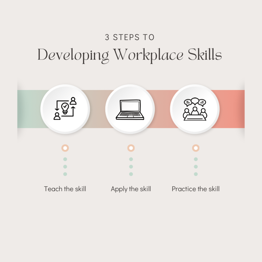 To develop workplace skills I recommend directly teaching the skill, applying the skill, and practicing the skill.